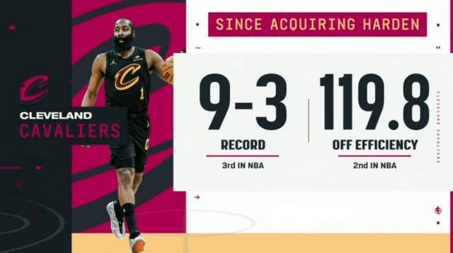 哈登在交易截止日前加盟骑士,目前代表球队打了9场比赛,球队取得8胜1负。而在获得哈登之后,骑士的成绩也是得到了进一步提升,取得9胜3负同时联盟第三,期间球队进攻效率119.8分排在联盟第二。有了哈登之后,骑士多了一个进攻大核,不再依赖米切尔,这对于球队的帮助也是很大的,如今的骑士已经成为东部冠军的有力竞争者。